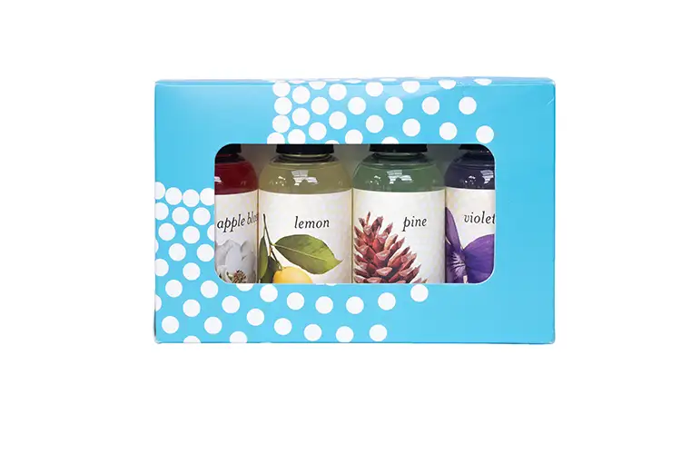 Oryginalne aromaty do urządzenia Rainbow. W zestawie 4 zapachy: cytryna, fiołek, sosna i kwiat jabłoni.